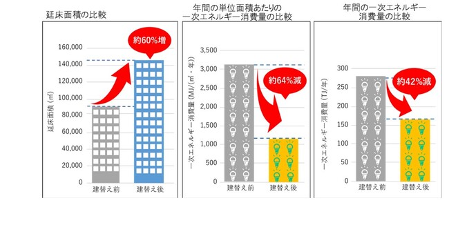 建替え後の延床面積は、建替え前(福岡ビル、天神コアビル、天神第一名店ビルの合計)に比べ、約1.6倍※1となる一方で、年間の一次エネルギー消費量は単位面積あたりで約64%減※2、全体で約42%減※2となる計画。