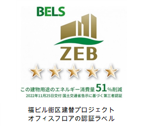 西日本鉄道(株)が推進する「福ビル街区建替プロジェクト」は、この度、環境性能評価において、BELS(※1)の最高ランクである星5つを獲得し、オフィスエリアで「ZEB Ready」、商業エリアでは「ZEB Oriented」、建物全体としても「ZEB Oriented」を取得いたしました。