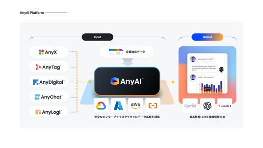 AnyAIでは、こうした背景を踏まえ、単なるAI技術の提供のみならず、各社の事業や経営に合わせたデータ活用基盤を合わせて提供し、ビジネスプロセスの革新をサポートします。