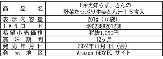 株式会社 永谷園(社長:成田 健一、東京都港区)は、フリーズドライみそを使用した徳用パック商品【「冷え知らず」さんの野菜たっぷり生姜とん汁15食入】を2024年10月19日(土)、20日(日)開催のECサイト「Amazon(Prime感謝祭)」にて先行発売いたします。その後、11月1日(金)より各種ECサイトにて新発売いたします。※Amazon販売ページURL https://amzn.asia/d/bREhVnw
