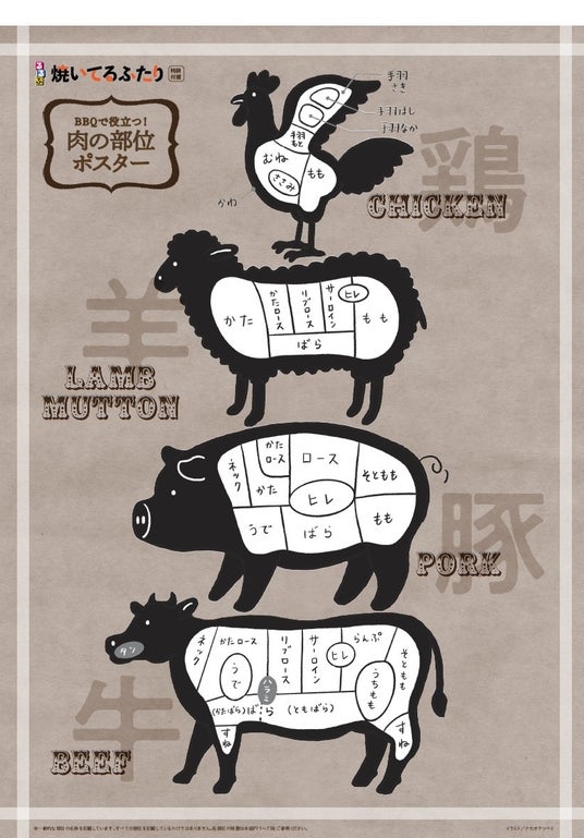本書オリジナルのポスター表面は、健太と千尋が部屋に貼ろうかと話していた肉の部位ポスター。漫画カットに描かれていた牛のほか、豚、羊、鶏もプラス。