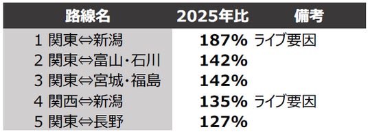 〇路線別では、関東⇔新潟(前年同期比187%)、関東⇔宮城・福島(同142%)、関東⇔富山・石川(同142%)などの中距離路線が好調