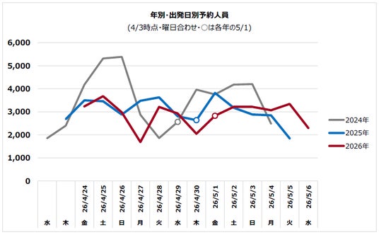 〇日並びの影響により、5月5日(火)・6日(水)の予約数が前年同期比180%超。4月27日(月)~5 月1日(金)が「分散旅行」の狙い目に