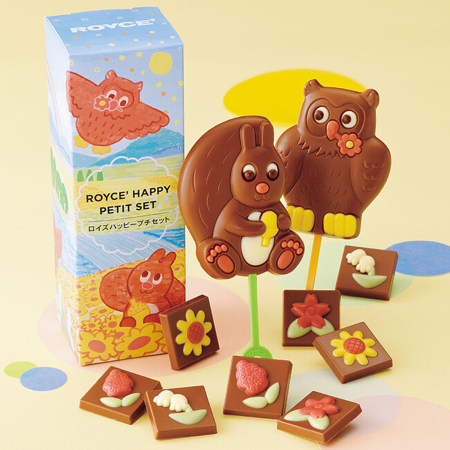 北海道・新千歳空港にあるロイズ チョコレートワールドで人気の、フクロウとリスのロイズポップチョコと、北海道に咲く花々をデザインしたロイズフラワーチョコを、動物たちが描かれた可愛らしいパッケージに詰め合わせました。