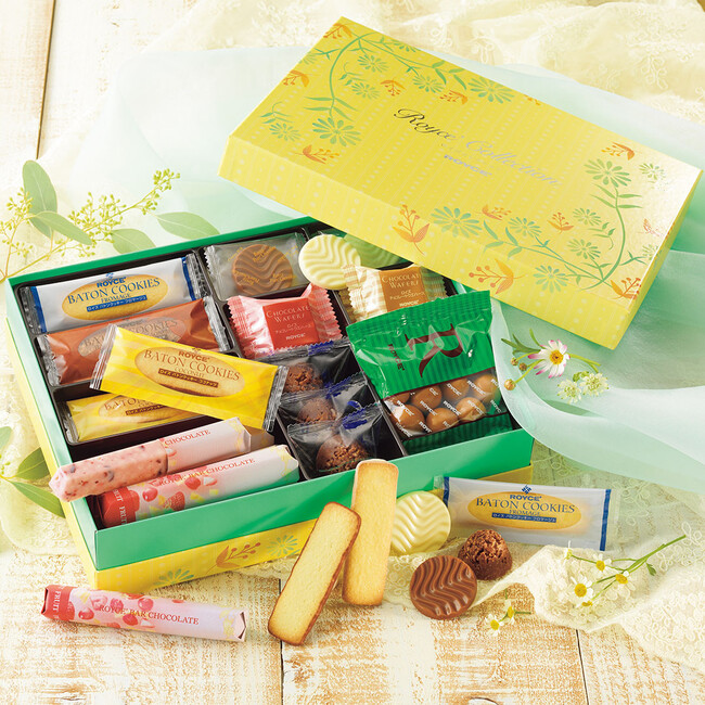 お花のモチーフが描かれた華やかで上品なデザインのボックスに、ロイズラスクやチョコレートウエハースなど4種類の味わいを詰め合わせました。春のちょっとしたご挨拶などに使いやすいプチギフトです。