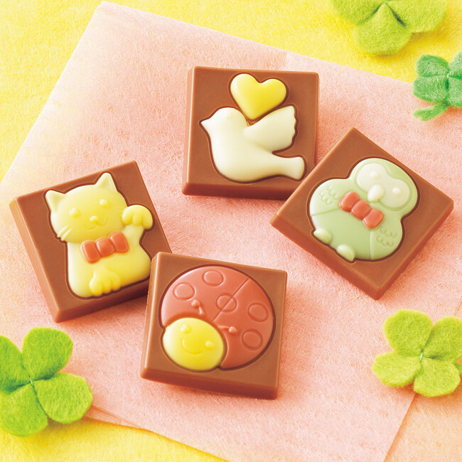 幸運の象徴とされる生き物やアイテムをモチーフにしたひと口サイズのチョコレート。ストロベリー風味のクリームをまろやかなミルクチョコレートで包み、フクロウ・てんとうむし・ハト・招き猫の4つをデザインしました。