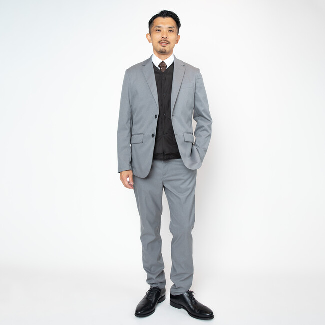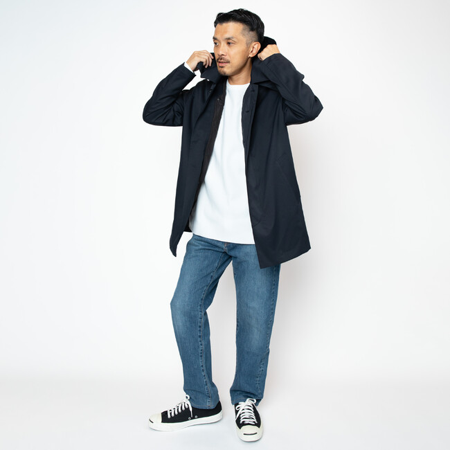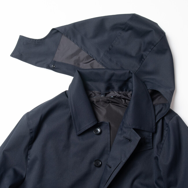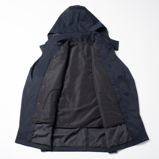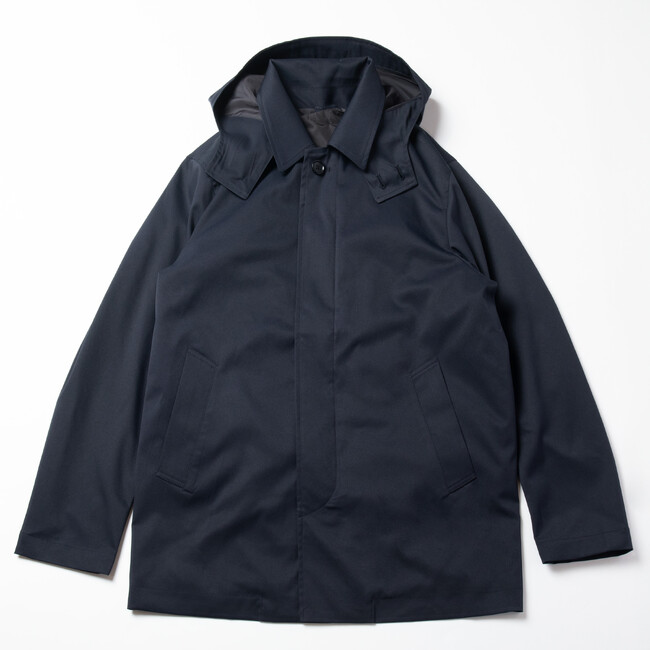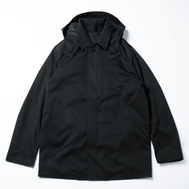 特徴:秋から春まで着用できるショート丈のアウター。スナップボタンで取り外し可能なベストは、スーツジャケットの下にインナーダウンとして着用でき、気温やスタイルに応じて着方を変えられます。フードは着脱可能。フード無ではステンカラーコートとして着用でき、フード有では顎下までボタンで留めることができるため、風よけに最適。生地には速乾・撥水・ストレッチ・防シワ・耐久性などの機能を備える自社オリジナル素材「ultimex」を使用。ベストの中綿は再生繊維を使用した環境にやさしい素材である「サーモライト(R)エコメイド中綿」を使用し、軽量かつ優れた保温性を実現しました。