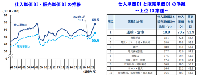 帝国データバンクの「TDB景気動向調査」で算出している2022年1月の仕入単価DIは68.5、同じく販売単価DIは調査開始以来最高の55.6となっています。2021年12月と比較すると、仕入単価は0.4ポイント、販売単価は0.3ポイントそれぞれ上昇しています。とりわけ、仕入単価DIは2020年6月(51.1)以降、横ばいを挟み20カ月連続で上昇となっていました。