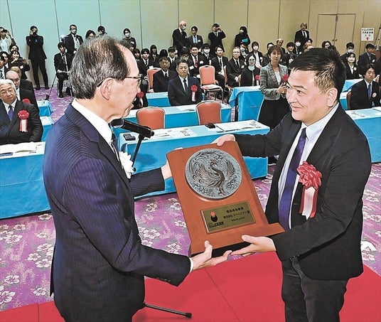 スペースワン代表の小林が福島県内堀知事から知事賞の盾を受けてとる様子