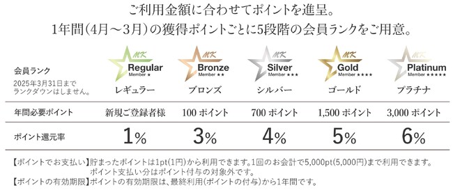 「MKレストラン」全店共通のポイントが貯まる機能を搭載。お会計の際に、ポイントが貯まります。ご利用状況に応じてポイント付与率がアップしますので、利用すればするほどお得に。