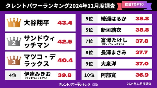 「タレントパワーランキング」2024年11月度調査(第4四半期)の総合トップ10を発表!