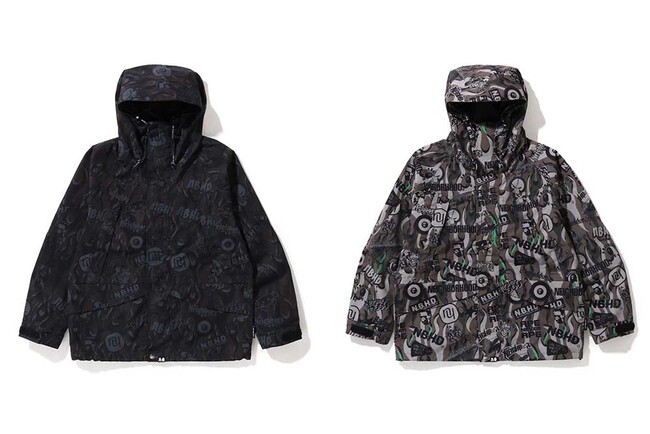 「NEIGHBORHOOD(R)」と「A BATHING APE(R)」、歴史ある両ブランドの往年のモチーフたちをふんだんに使 いデザインされた L/S TEE や RELAXED FIT PULLOVER HOODIE。 双方のロゴを融合し再構築したグラフィックを落とし込んだ TEE、 RELAXED FIT CREWNECK。 さらに今コレクションのために制作されたオリジナルカモフラージュを施した RELAXED FIT KNIT、 SNOWBOARD JACKET、MULTI POCKET TRACK PANTS、CAP などもラインアップ。
