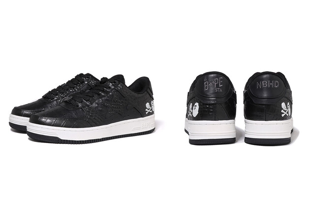 BAPE STA™️はアッパーがブラック、ソールをホワイトのカラーリングでまとめ上げ、アッパーや STA にクロコダイルと オーストリッチのエンボスがされており、重厚感あふれる一足に仕上がっています。 サイド部分にはスカル&エイプヘッドのコラボレーションロゴが施され、ヒールの左右に BAPE STA ロゴ、NBHD ロ ゴがアシンメトリーに配置されています。
