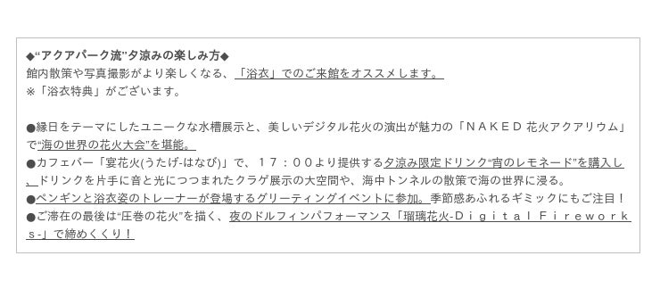 そこで当館は、涼しい時間からのご来館で、快適に夏を満喫できる“アクアパーク流”夕涼みをご提案します。