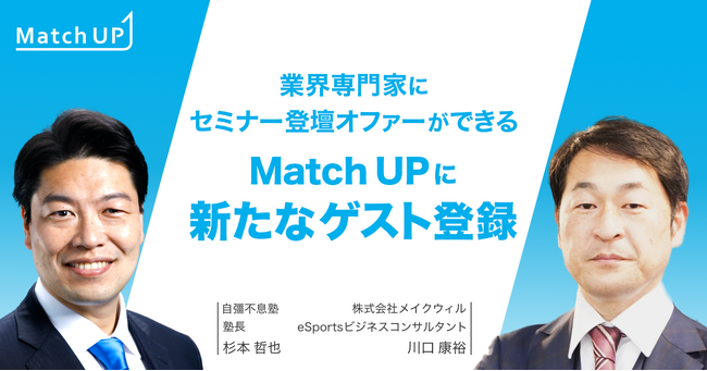 株式会社イノベーション(東証グロース 証券コード 3970)のグループ会社である、株式会社Innovation X Solutions(本社:東京都渋谷区、代表取締役社長:遠藤俊一、以下「Innovation XSolutions」)は、業界専門家に企業が主催するセミナー/イベントへの登壇オファーができるマッチングサイト「Match UP」に、自彊不息塾 塾長 杉本 哲也氏、株式会社メイクウィル eSports ビジネスコンサルタント 川口 康裕氏など、豪華専門家が新たにゲスト登録されたことをお知らせします。