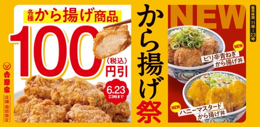 株式会社吉野家(本社:東京都中央区、代表取締役社長:成瀬哲也、以下吉野家)は、6月17日(火)から6月23日(月)23時までの期間「から揚げ」を販売している店舗※で「から揚げ」商品を税込価格から100円引きで提供する『から揚げ祭』を開催します。店内飲食とテイクアウトの両方が対象です。店内で「から揚げ定食」や「W定食(牛皿・から揚げ定食)」など定食をお召し上がりになるお客様はご飯増量・おかわりは無料です。また、テイクアウト限定商品となる「W弁当(牛皿・から揚げ弁当)」はご飯の増量を無料で承ります。6月5日に販売開始した、新商品の「ピリ辛青ねぎから揚げ」・「ハニーマスタードから揚げ」の丼・定食も割り引き対象となっておりますのでこの機会にぜひお召し上がりください。