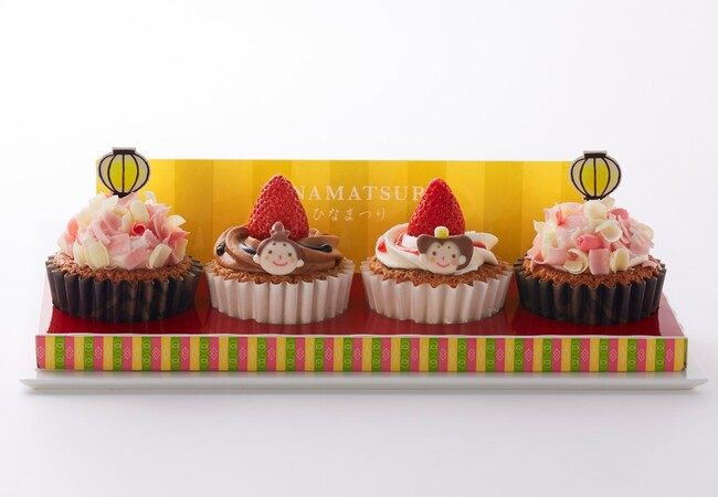 ひなまつりのデコレーションを施した華やかなカップケーキの詰合せ。おひなさま (中右)とおだいりさま(中左)には、ふわふわのスポンジの中に手炊きのカスタードクリーム、春てまり(ミニ)(両端)にはいちごクリームが入っています。家族揃ってのお祝いにおすすめのひなまつりケーキセットです。