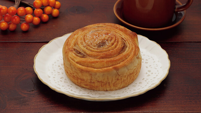 キャラメル風味のクリームを巻き込み、深い味わいに仕上げたシナモンロールです。ザラメ糖をトッピングしました。ティータイムにもおすすめです。