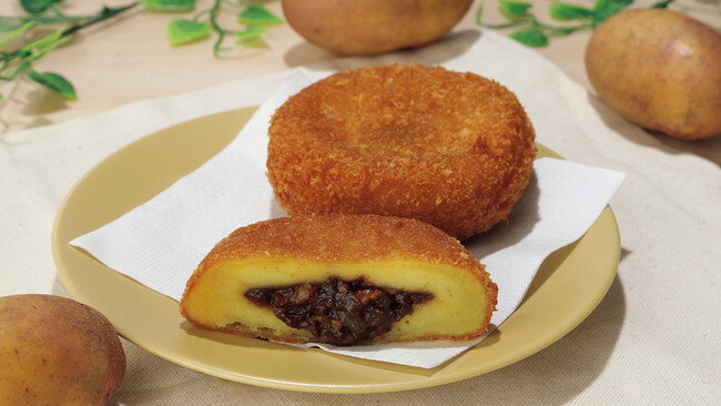 食べると驚きのもちもち食感、中からトロッとカレーが溢れます。そのもちもち食感の正体は「いももち」。いももちにパン粉を付けて揚げることで、見た目もまるでカレーパンのように仕上げた、楽しくて美味しい、いももちです。