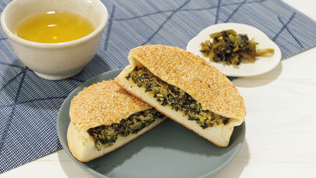長野県の郷土料理として知られる「おやき」をイメージしたパンです。高菜油炒めと博多明太マヨを合わせた具材をパンに包み、風味豊かな白ごまをトッピングしました。高菜のシャキッと食感と明太マヨが生地の香ばしさと良く合います。