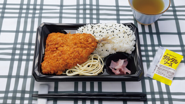 ご飯を覆い隠すかのような約120gの大きなアジフライをドカンと1枚添えました。淡白な風味のアジフライは、別添のタルタルソースと一緒に食べることで濃厚な味わいを楽しめます。