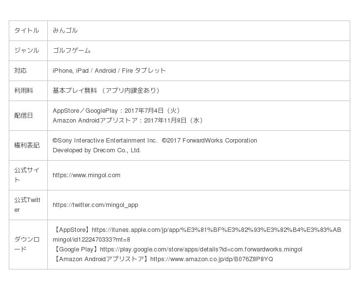 『みんゴル』は、「プレイステーション」を代表する作品のひとつ「みんなのGOLF」シリーズの“誰でも簡単にゴルフゲームを楽しめる”というコンセプトを、スマートフォンの特性や、プレイスタイルに合わせて最適化し、誰もが、いつでもどこでも、爽快ショットで手軽にゴルフゲームをお楽しみいただけます。