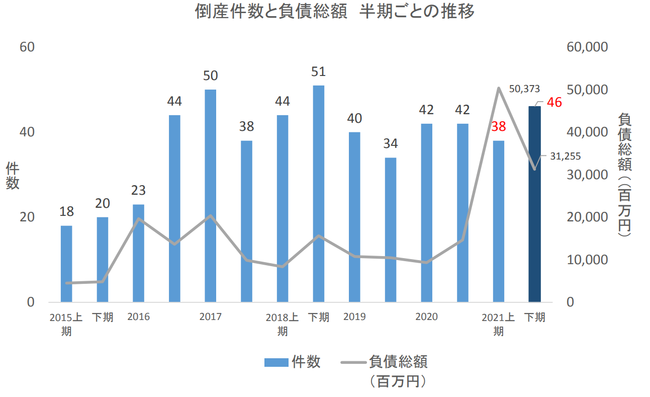 半期ベースでみると、2021年下期は前期比21.1%増の46件と急増しており、倒産増加の兆しも