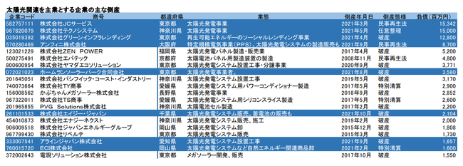 2006年以降に発生した太陽光関連を主業とする企業の主な倒産を表に示した。