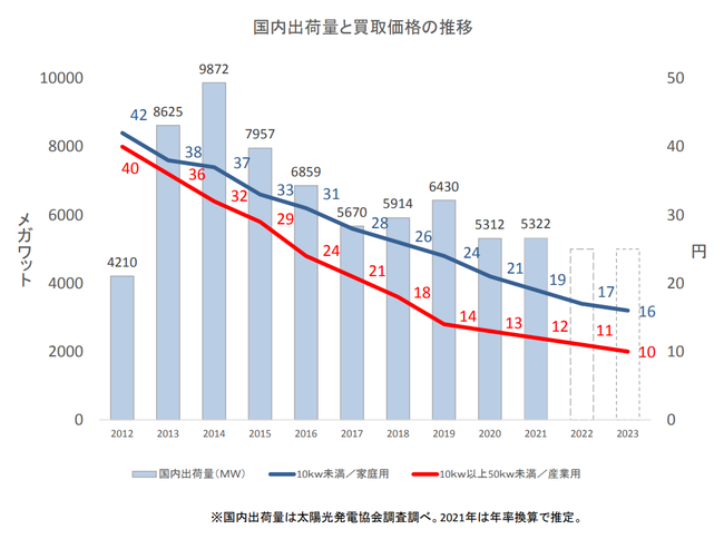 太陽光発電協会によれば、2021年の国内出荷量は5322メガワットと2014年比で46.1%減少した。固定価格買取制度(FIT)に基づく買取価格は家庭用が19円と2012年比でほぼ半減、産業用(10キロワット以上50キロワット未満)に至っては12円と3分の1以下になっている。