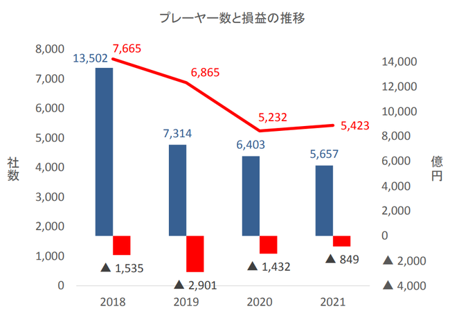 2021年のプレーヤー数は5423社と2018年比で29.2%減少。市場規模は54.4%減の22.5兆円、黒字額は58.1%減の5657億円。ただし赤字額も縮小している