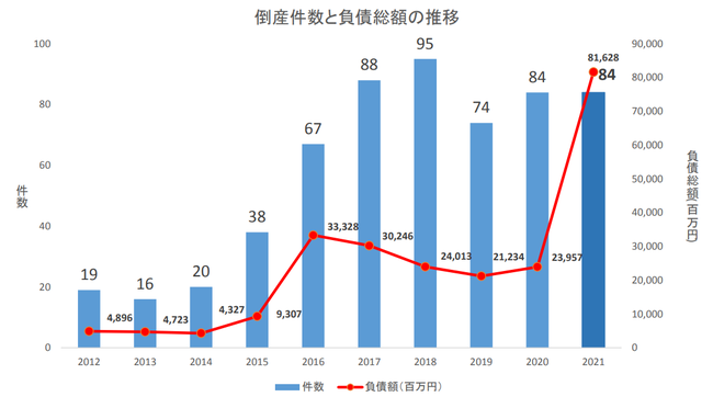 2021年の倒産件数は前年比横ばいの84件。大型倒産が多く発生したことにより、負債額は同3.4倍増の816億2800万円