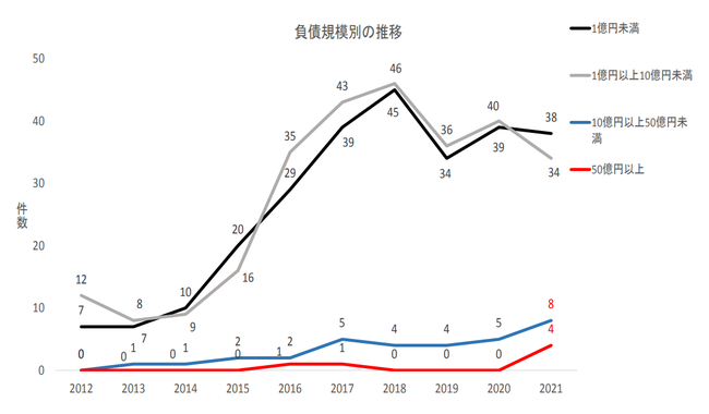 負債規模別の推移を示した。2014年以降、負債総額が10億円に満たない中小企業の倒産が中心だったが、2021年は負債10億円以上50億円未満、また50億円以上の倒産が増えている。