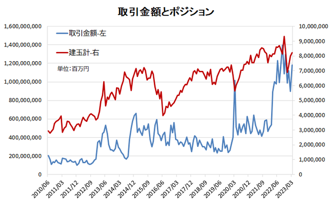 (出所)金融先物取引業協会の「店頭FX月次速報」をもとに、当社が作成。左軸-取引金額、右軸-ポジション計グラフ中のデータ単位は百万円。 2. 株式会社外為どっとコムFX投資家動向2023年3月