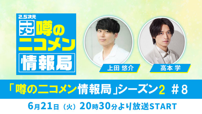 ニコニコ生放送、ニコニコチャンネル「2.5次元 やっぱニコメン」でレギュラー放送中の、舞台・ミュージカル・俳優ジャンルの情報トークバラエティー「噂のニコメン情報局」。毎回旬な俳優をゲストに放送中の本番組で第8回目ゲストとして、上田悠介と高本学(※50音順)の生出演が決定した。放送は6月21日(火)20時30分から。またゲスト発表と同時に、今回だけのアニメイトのオンラインくじ[くじメイト]の販売も発表された。このくじではゲスト二人が描くイラスト入りTシャツ等が当たるほか、条件を満たすと6月21日(火)20時30分からの本番組の観覧に、人数限定20名様を特別招待する豪華な賞品も!尚、くじ販売は6月6日(月)から6月12日(日)までの期間限定となっている。このレアなプレゼントが当たるこの企画に、ぜひ参加いただきたい。