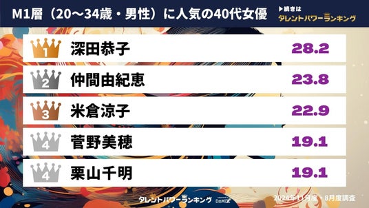 『タレントパワーランキング』では、タレントパワーランキングに登録されている40代女優について、M1層(20~34歳男性)とF1層(20~34歳女性)が回答した、それぞれの結果を調査。