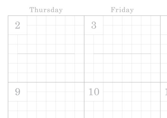 『ダイアリー A5スリム マンスリー』には4mm方眼、『ダイアリー B6スリム マンスリー』には5mm方眼を各日のマス目に印刷しています。筆記時のガイドはもちろん、『STALOGY』ブランドの『マスキング丸シール』を貼る際の目安にもなります。限りなく細く薄いグレーで印刷されているので、グリッドを使用しないときは悪目立ちせず、筆記を邪魔しません。