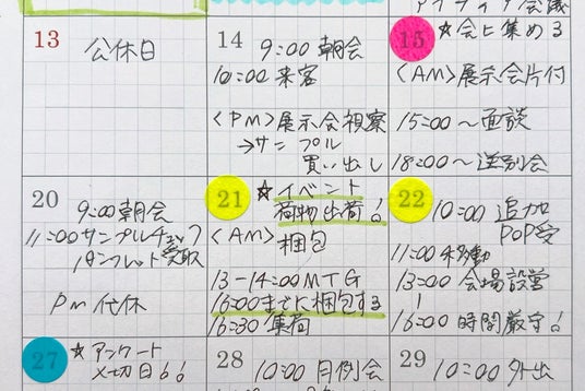 各日のマス目を上下に二分割するセンターラインを引いています。午前と午後の予定、仕事とプライベートの予定、自分と家族の予定などを分けて管理することができるので、用途に応じた自由な使い方が可能です。