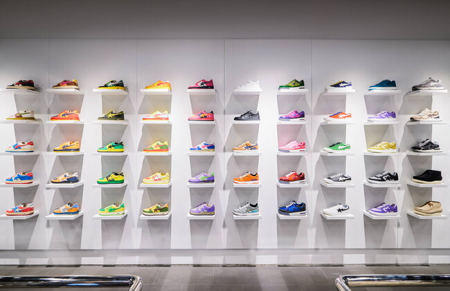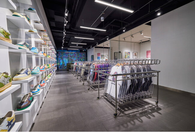 40足のBAPE STA™️が展示されたインパクトのある壁面が設置されたBAPE(R)︎ MERCHANDISEエリア。BAPE STA™️の新作スニーカーやアパレルの販売も予定されています。