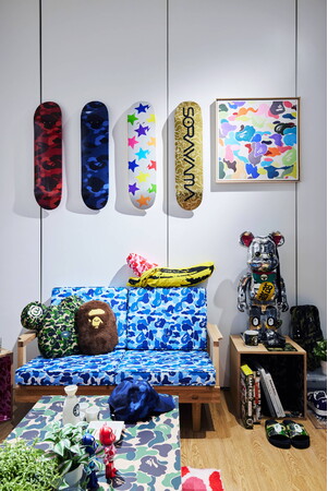 BAPE(R) HOMEエリアは、リビングルームとベッドルームに分かれて展示。BAPE(R) × FABRICK × KARIMOKUによる、 ABC CAMOのソファ、フォールディングテーブル、スクエアシェルフを筆頭に、BAPE(R)︎の代表的なカモフラージュやエイプヘッド、シャークデザインを基にデザインされたクッション、カフェテーブル、スケートボードなどをラインアップ。BAPE(R)︎のDNAを日常に取り入れ、ライフスタイルとストリートが融合された空間が完成しました。