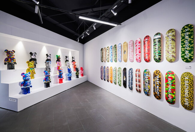 メタルで製作されたBABY MILO(R)、さまざまなコラボレーションで登場した34体のBE@RBRICK 1000%、スケートボードのコレクションなどが展示され、BAPE(R)︎の遊び心溢れる歴代のコレクションを存分に堪能することができます。