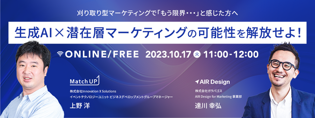 株式会社イノベーション(東証グロース 証券コード3970)のグループ会社である、株式会社Innovation X Solutions(本社:東京都渋谷区、代表取締役社長:遠藤俊一、以下「Innovation X Solutions」)は、2023年10月17日(火に開催される「生成AI×潜在層マーケティングの可能性を解放せよ!」をテーマとしたセミナーを株式会社ガラパゴスと共催で開催します。