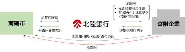 南砺市の本制度の対象事業に関する情報を、寄附を検討する当行のお客さまに提供することで、民間企業の本制度の活用を促進するとともに、ひいては官民連携事業の創出を通じた地方創生の推進を図ることを目的とします。