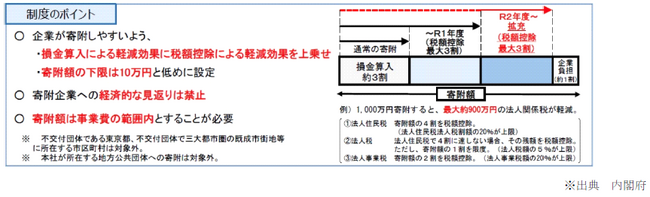 2016年に創設された本制度は、国が認定した地域再生計画に位置付けられる地方公共団体の地方創生プロジェクトに対して企業が寄附をおこなった場合に、法人関係税から税額控除する仕組みです。