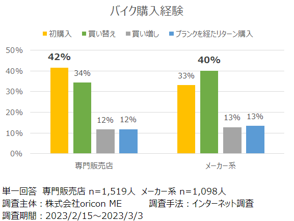 バイクの購入経験について尋ねたところ、専門販売店は「初購入」が最も高い一方、メーカー系は「買い替え」が最も高い結果となりました(右下図参照)。