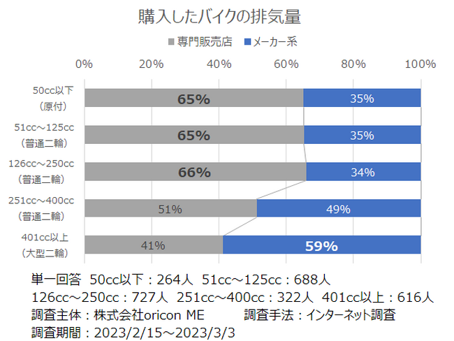 購入したバイクの排気量ごとに『専門販売店』と『メーカー系』のどちらを利用したのか割合を比較したところ、250cc以下は専門販売店、大型二輪はメーカー系で購入した割合が高い結果となりました(下図参照)。