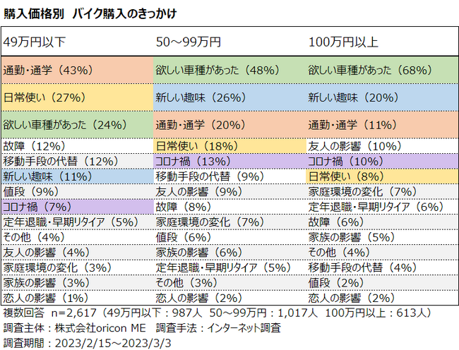 購入価格別では、価格が高くなるほど「欲しい車種があった」ことをきっかけにあげる人が多く、次いで「新しい趣味」となり、趣味性の高さが表れています。対して、49万円以下では、「通勤・通学」が最も多く、次いで「日常使い」となっており、比較的安価な車種は実用面をきっかけに購入に至ったといえそうです。