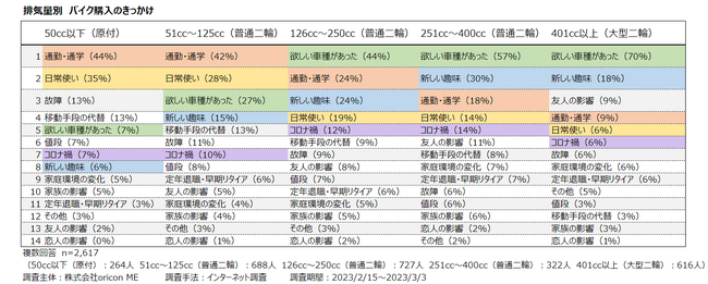 バイク購入のきっかけ 大型ほど趣味性が高い結果に