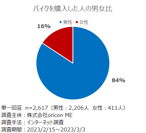 バイクを購入した人の男女比率は、男性が84%、女性が16%となり、男性が大多数を占める結果となりました。