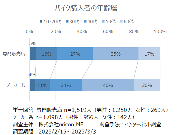 『専門販売店』『メーカー系』の回答者を足し合わせ、バイク購入者全般の傾向を分析しました。