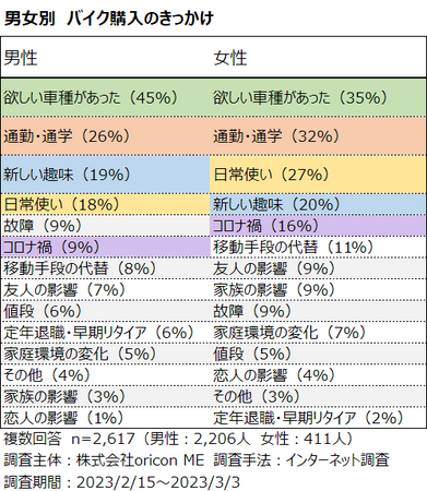 「コロナ禍」きっかけは女性で16%、購入したバイクの排気量251cc~400ccで14%